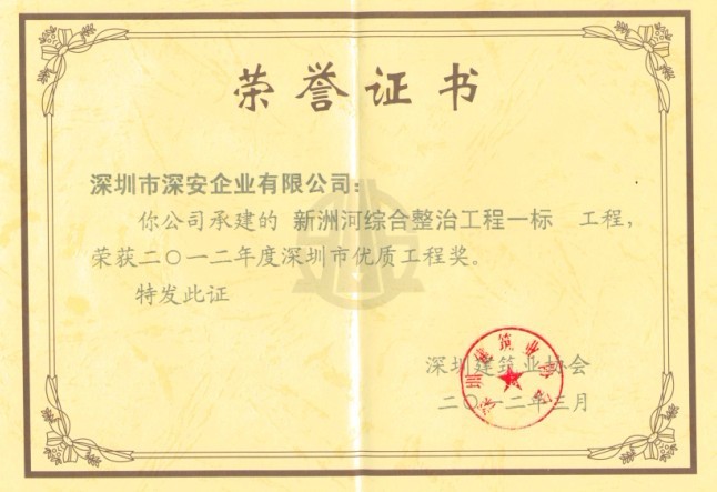 深安企業(yè)“新洲河綜合整治工程一標(biāo)”工程榮獲深圳市優(yōu)質(zhì)工程獎(jiǎng)