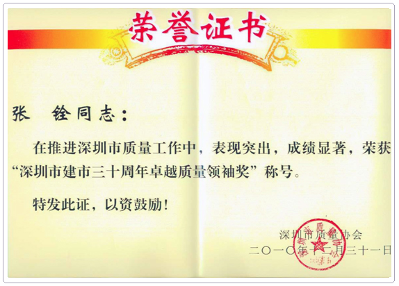 深安企業(yè)董事長(zhǎng)朱小萍獲“2010年度深圳市優(yōu)秀施工企業(yè)家”榮譽(yù)稱號(hào)