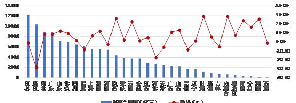 從各地區(qū)建筑業(yè)總產(chǎn)值增長情況看,有 27 個地區(qū)的建筑業(yè)總產(chǎn)值較上年同期有不同幅度的增長。其中,廣東、新疆、北京的增幅均超過 15%。有 4個地區(qū)出現(xiàn)負(fù)增長,其中,浙江出現(xiàn)了 超過20% 的負(fù)增長(圖 2)。