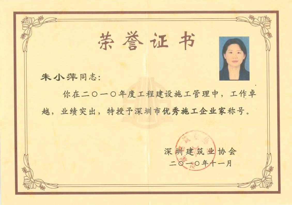 深安企業(yè)董事長(zhǎng)朱小萍獲“2010年度深圳市優(yōu)秀施工企業(yè)家”榮譽(yù)稱號(hào)