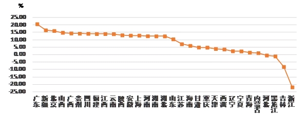 從各地區(qū)建筑業(yè)總產(chǎn)值增長情況看,有 27 個地區(qū)的建筑業(yè)總產(chǎn)值較上年同期有不同幅度的增長。其中,廣東、新疆、北京的增幅均超過 15%。有 4個地區(qū)出現(xiàn)負(fù)增長,其中,浙江出現(xiàn)了 超過20% 的負(fù)增長(圖 2)。