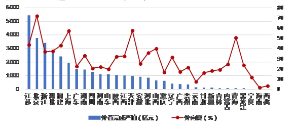 從外向度(即本地區(qū)在外省完成的產(chǎn)值占本地區(qū)建筑業(yè)總產(chǎn)值的比例)來看,排在首位的是北京,為71.86%。外向度超過50%的是天津、上海、青海,分別為57.57% 、 57.33%、50.63%,超過 30% 的還有江蘇、福建、山西、湖北、浙江、河北、湖南、江西、陜西和遼寧 10 個地區(qū)(圖 4)。