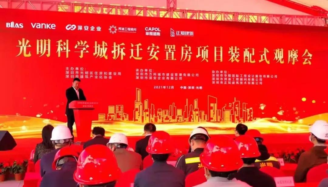 2021年12月30日,深圳市光明區(qū)2021年度裝配式建筑示范項目觀摩活動,在深安企業(yè)光明科學城拆遷安置房項目舉行。深圳市住房和建設局、光明區(qū)住房和建設局及深圳市建筑產(chǎn)業(yè)化協(xié)會有關負責人出席活動并致辭,深安企業(yè)總經(jīng)理吳潮豐代表施工總承包單位致辭。